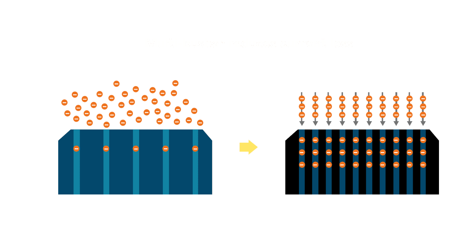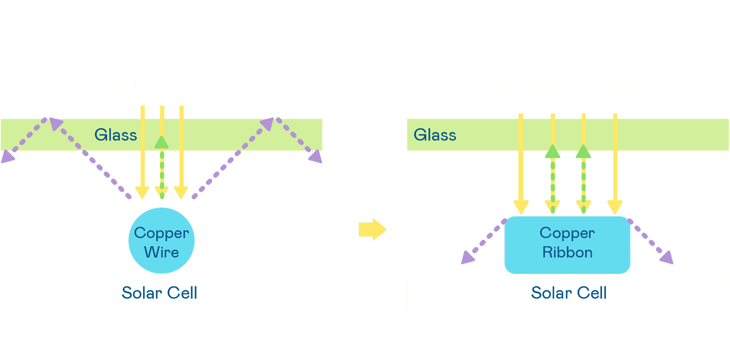 - 电池使用多条铜导线 (Copper wire) 于电池片上形成较短的电流路径,,,提高电流收集效率,,,,采用圆形设计的铜导线较传统扁平式的铜焊带 (Ribbon),,,,可增加入射至电池的光线量。。。